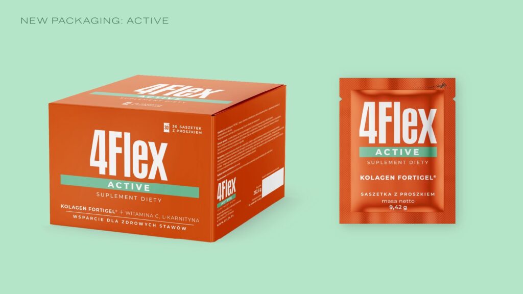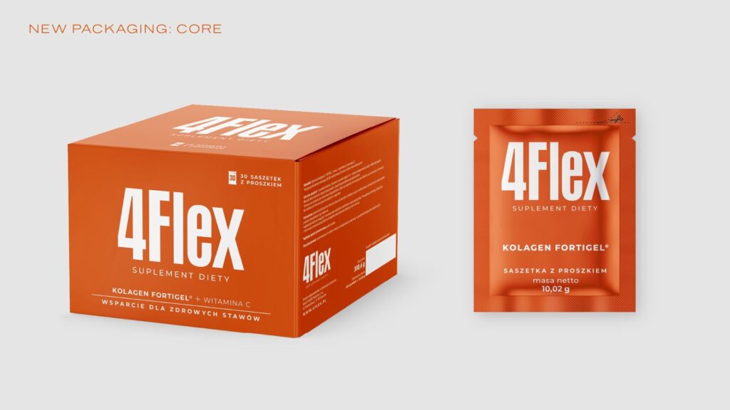 Odświeżenie pozycjonowania, strategii rozwoju i identyfikacji wizualnej marki 4Flex, obejmujące redesign opakowań, rozszerzenie portfolio oraz wzmocnienie percepcji jakości i nowoczesności w konkurencyjnej kategorii suplementów kolagenowych
